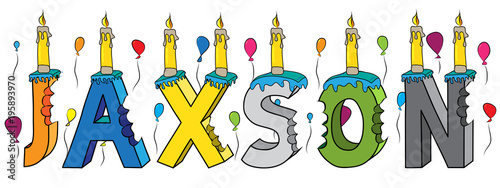 Jaxson male first name bitten colorful 3d lettering birthday cake with candles and balloons