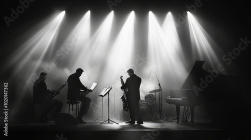 Jazz band in silhouette, musicians on piano, sax, and drums, playing under stage lights with floating music notes