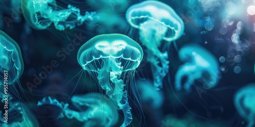 Jellyfish colony with a captivating blue green glow gracefully glides through the aquarium creating a mesmerizing and peaceful spectacle