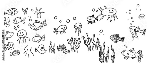 Jellyfish connect the dots full page picture puzzle and coloring page, featuring underwater life themes, including fish, starfish, seabed, and algae