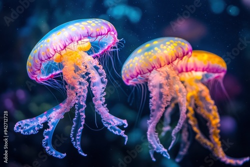 Jellyfish in bright fluorescent colors with a dark background, ai