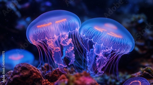 Jellyfish with neon glow light effect in aquarium, ibioluminescent jellyfish