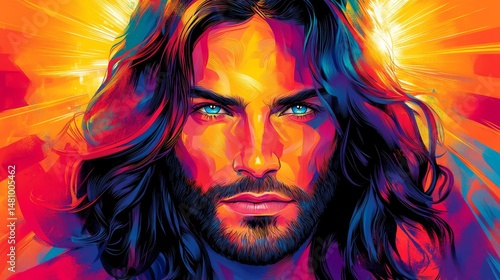 Jesus is depicted in a portrait illustration that showcases a digital art style with a vibrant orange and yellow glow emanating from his back
