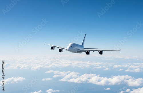 Jet Airliner Navigates Through Expansive White Clouds in Blue Sky Evoking Peace, Distance, and Airborne Exploration