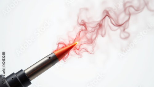 Jet flame ignites from nozzle with trail of red smoke in clean controlled laboratory setting