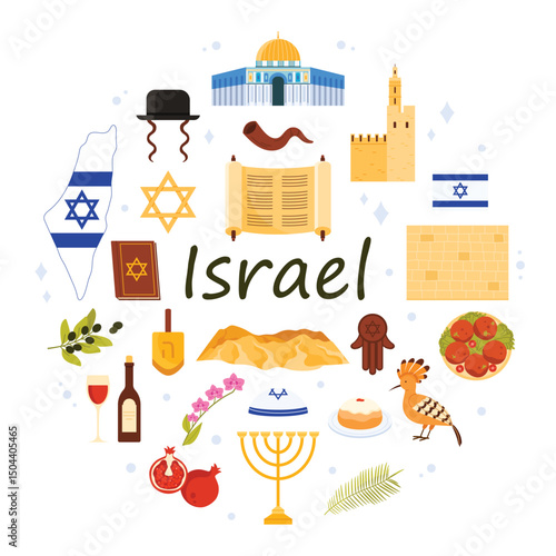 Jewish culture elements and famous landmarks, flag and map of Israel, Judaism symbols in round infographic banner with title. Torah and hamsa, dreidel and falafel, shofar cartoon vector illustration