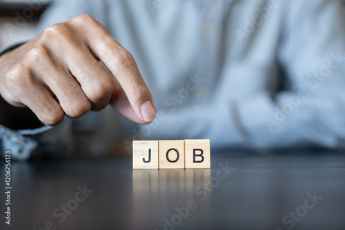 JOB concept. Business man hand holding wooden cube words JOB on a wood block