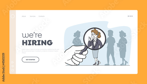 Job Hiring Recruitment Landing Page Template. Huge Hand with Magnifier Choose Businesswoman Character Stand Out of Crowd