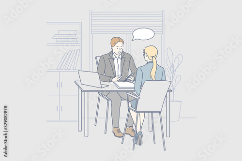 Job interview, communication, service, hr, business concept. Business people, businessman woman employer employee clerk hr manager company workers in office together. Hiring process. Customer service.