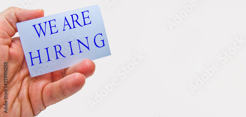 Job recruiting advertisement represented by 'WE ARE HIRING' texts on cards in man's hands