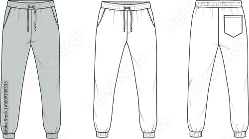 Jogger pants technical flat sketch, front and back view with drawstring waist and cuffed hem – fashion design template