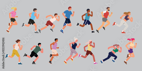 Jogging people group. Men, women crowd running. Many runners in line. Diverse joggers characters in motion, action. Sport exercise, marathon. Flat vector illustration isolated on white background.
