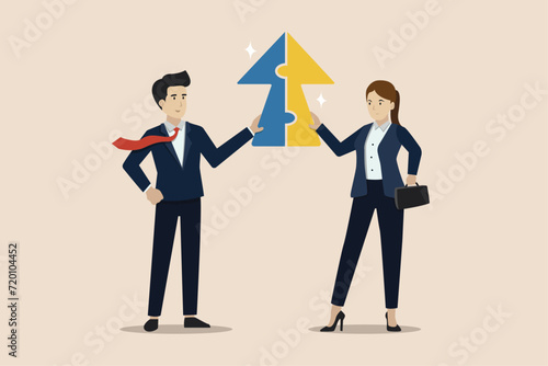 Joint venture business partnership agree to share resource and work together to achieve same goal, cooperation concept, businessman connect growth arrow jigsaw puzzle.