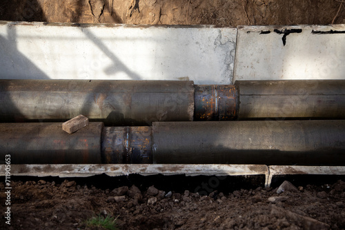 Jointed steel pipes insulated with polymer mineral foam insulation. Construction process of the heating tracks.