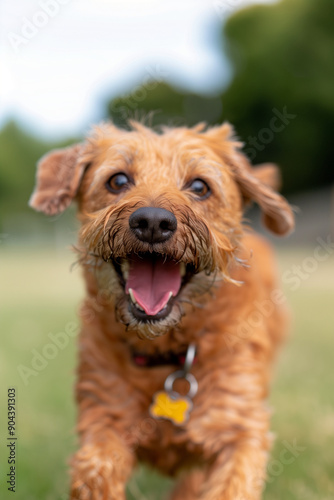 Joyful brown dog running happily in a green field, tongue out, mouth open, full of energy and joy, enjoying the outdoors