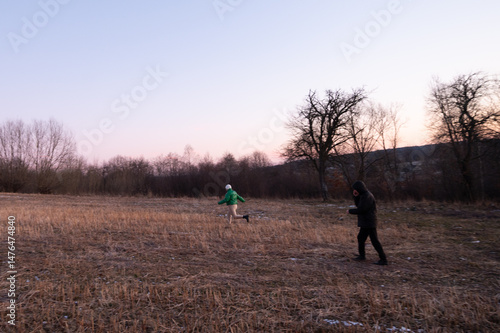 Joyful children playing in an open field during the twilight hours surrounded by trees with a serene landscape at dusk near a quiet village