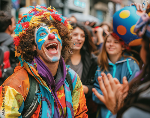 Joyful Clown Entertaining Crowd at Colorful Street Festival.