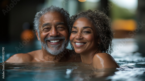 Joyful couple enjoying time together in a serene indoor pool during a relaxing afternoon. Generative AI