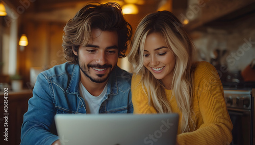 Joyful couple sharing a moment together while using a laptop in a cozy indoor environment