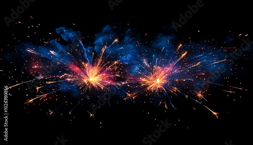 Joyful explosions of fireworks illuminating the night, vibrant streaks of red, blue, and gold, perfect for holiday events and celebrations