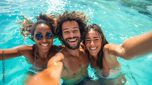 Joyful friends capturing a fun moment together while swimming in the clear blue waters.