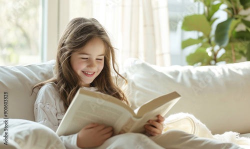 Joyful girl with a radiant smile, deeply engaged in a storybook while lounging on a soft white sofa in a Scandinavian living area