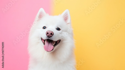 Joyful Husky Portrait: A pure white husky, with its fluffy fur and captivating eyes, radiates happiness. Smiling and facing the viewer, it embodies the pure joy.