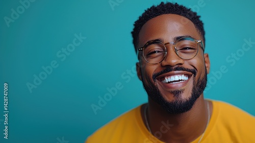 Joyful Man Smiling with Glasses Against a Vibrant Blue Background