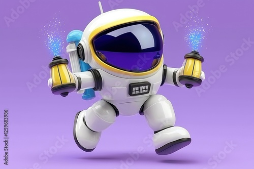 Joyful Robot Astronaut Running with Sparkling Lanterns on Purple Background