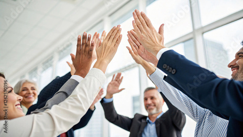 Joyful Team Celebrating Success with High-Five Gesture in Modern Office Environment