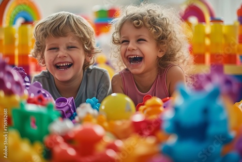 Joyful toddlers discovering the sheer delight of exploring a world filled with diverse, colorful toys.