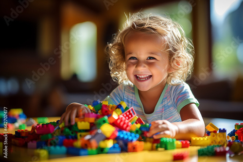 Joyous moment of a kid engrossed in play, creating a world of wonder with vibrant and colorful pieces. Ai generated