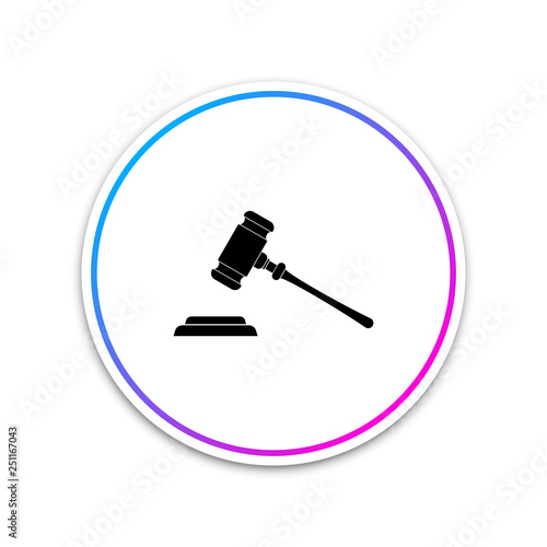 Judge gavel icon isolated on white background. Gavel for adjudication of sentences and bills, court, justice, with a stand. Auction hammer symbol. Circle white button. Vector Illustration