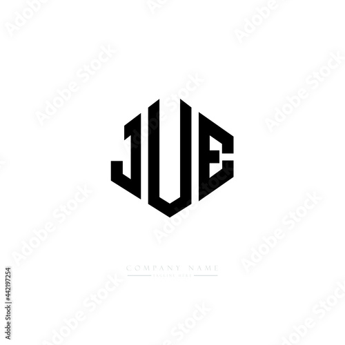 JUE letter logo design with polygon shape. JUE polygon logo monogram. JUE cube logo design. JUE hexagon vector logo template white and black colors. JUE monogram, JUE business and real estate logo.