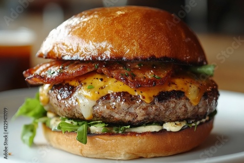 Juicy cheeseburger with crisp bacon and fresh greens served on a toasted bun in vibrant setting
