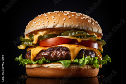 Juicy Cheeseburger with Fresh Lettuce, Tomato, and Pickles on a Sesame Seed Bun - Generative AI