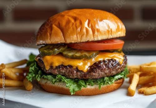 Juicy Cheeseburger with Lettuce, Tomatoes, Pickles, and Crispy Fries Displayed on a White Paper with a Rustic Background for Food Photography