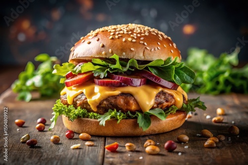 Juicy Cheeseburger with Sesame Seed Bun, Melted Cheese, Fresh Greens, and Red Onions on Rustic Wooden Table