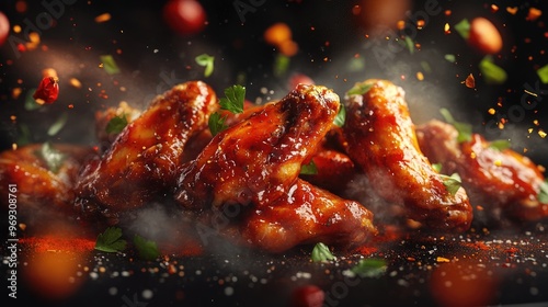 Juicy chicken wings in buffalo sauce, with flying spices and ingredients, creating a dynamic visual of hot, ready-to-serve food.