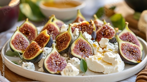 Juicy fresh figs on a platter, paired with goat cheese and honey, rustic and gourmet.