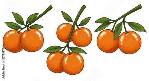 Juicy Oranges on Branch - Three illustrations of oranges on branches with green leaves, perfect for fresh food, healthy eating, or citrus themes