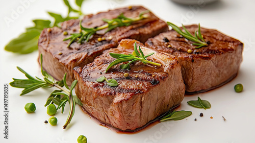 Juicy steak pieces garnished with fresh herbs and spices, showcasing delicious and appetizing presentation