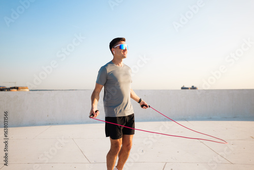 Jumping rope for fitness and enjoyment on a sunny rooftop with skyline views and a smiling man in sporty attire