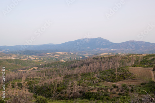 June 2024, mountainous scenery in North Evia with many burnt trees, three years after the disastrous wildfire of August 2021