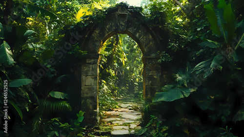 Jungle gateway: a mysterious and evocative image of a stone archway overgrown with lush foliage, hinting at a hidden world within the depths of the jungle. Hidden Worlds. Illustration