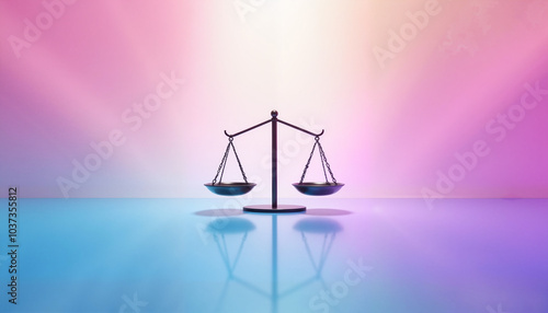 Justice scales reflecting on smooth surface with pink and blue light