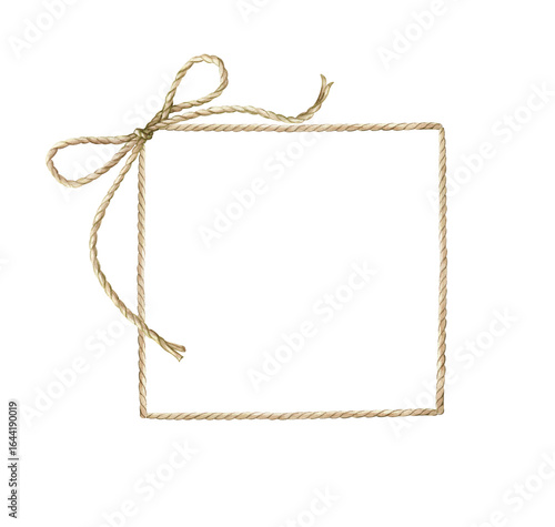 Jute rope frame square. Hand drawn watercolor illustration isolated on a white background . Copy space for text. Template for postcard, scrapbooking