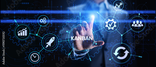 Kanban work flow process management system concept on virtual screen.