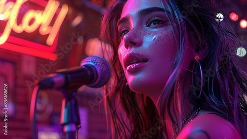 Karaoke night concept image shows a young woman singing karaoke at a club next to a sign.