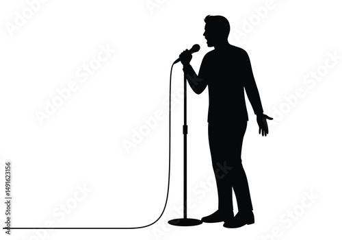 Karaoke silhouette. This image shows a black silhouette of a person singing into a microphone on a stand. Vector clipart illustration design.